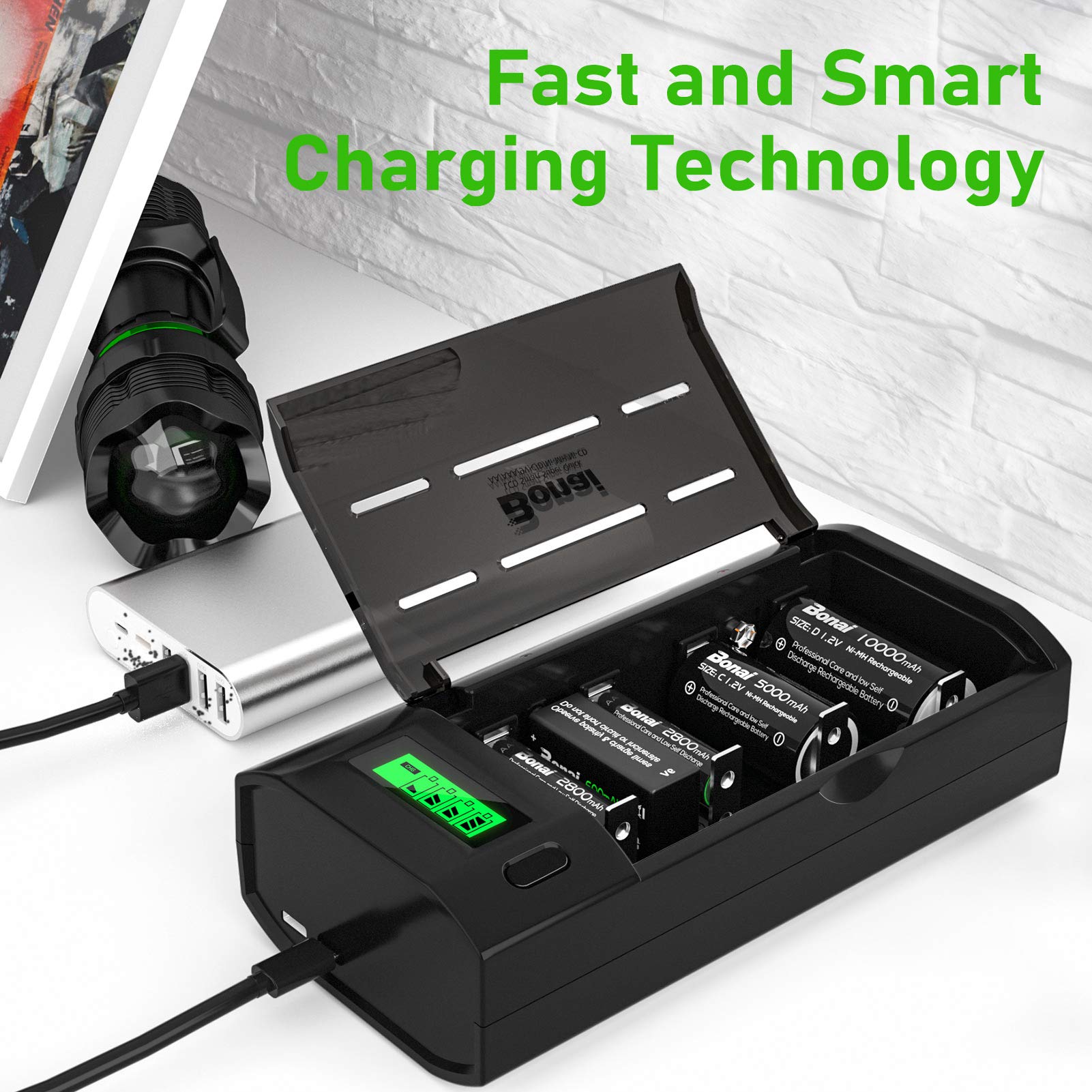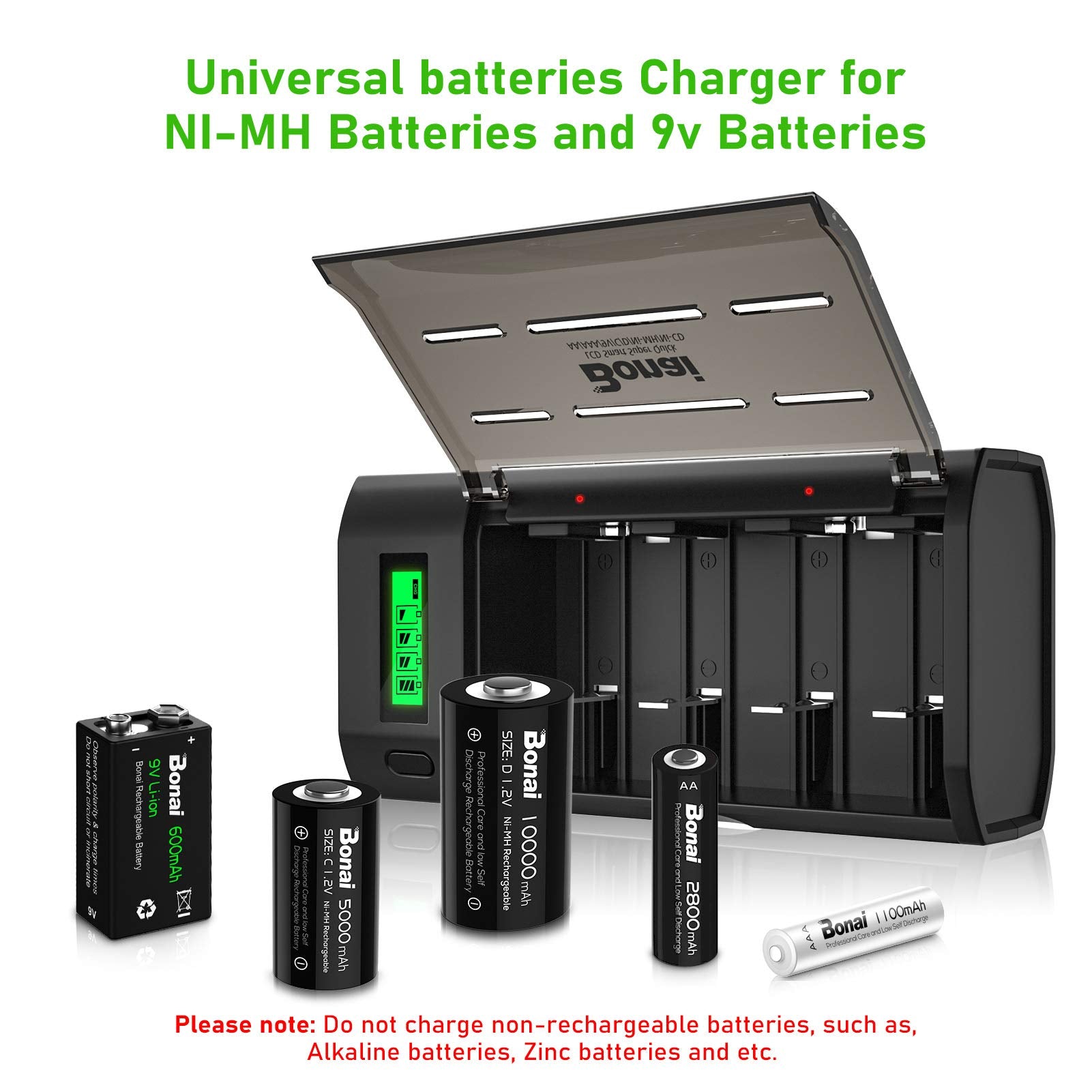 BONAI LCD Pantalla Cargador de Pilas Inteligente para AA/AAA/SC/C/D/9V Ni-MH/Ni-CD, Universal Con Función de Descarga (USB)