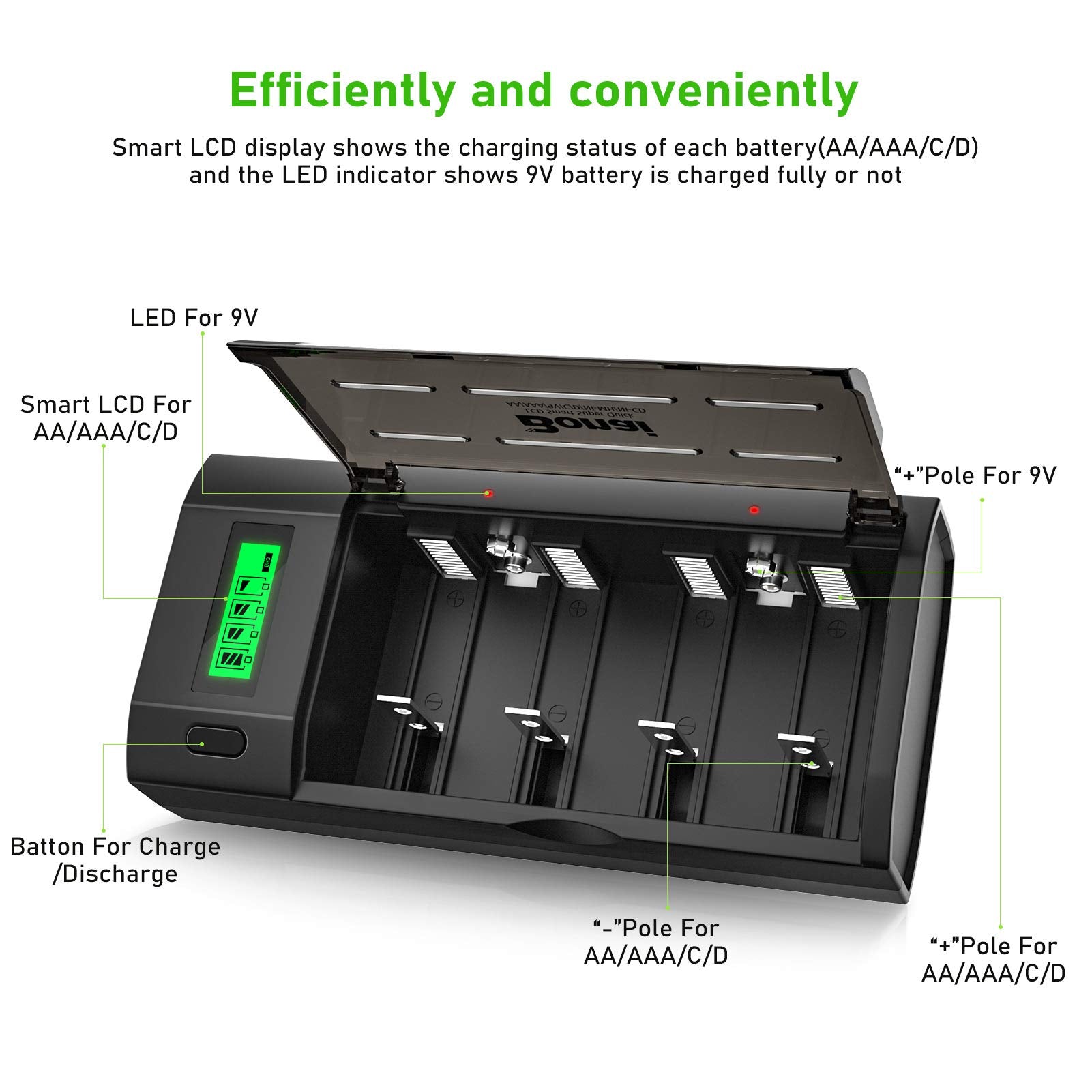 • 🔋LCD Cargador de Pilas: Ranura de carga independiente. Puede contener hasta 4 Cargador baterías recargables de tamaño AA / AAA / SC / C / D Ni-MH / Ni-CD y 2 baterías recargables 9V Ni-MH / Ni-CD carga al mismo tiempo.