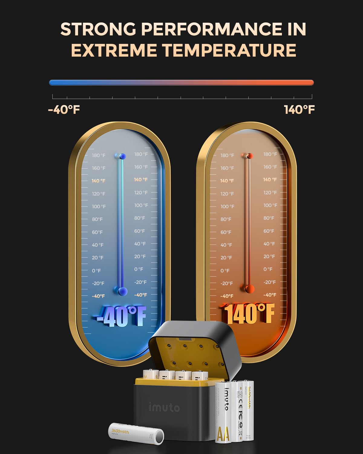 • 【Alta capacidad】Con una alta capacidad de 3000 mWh y una mayor densidad de energía, las baterías de litio recargables de iMuto almacenan de manera eficiente más energía con el mismo volumen. Proporcionan una fuente de alimentación estable de 1.5 V y una vida útil cinco veces más larga que las baterías alcalinas.
