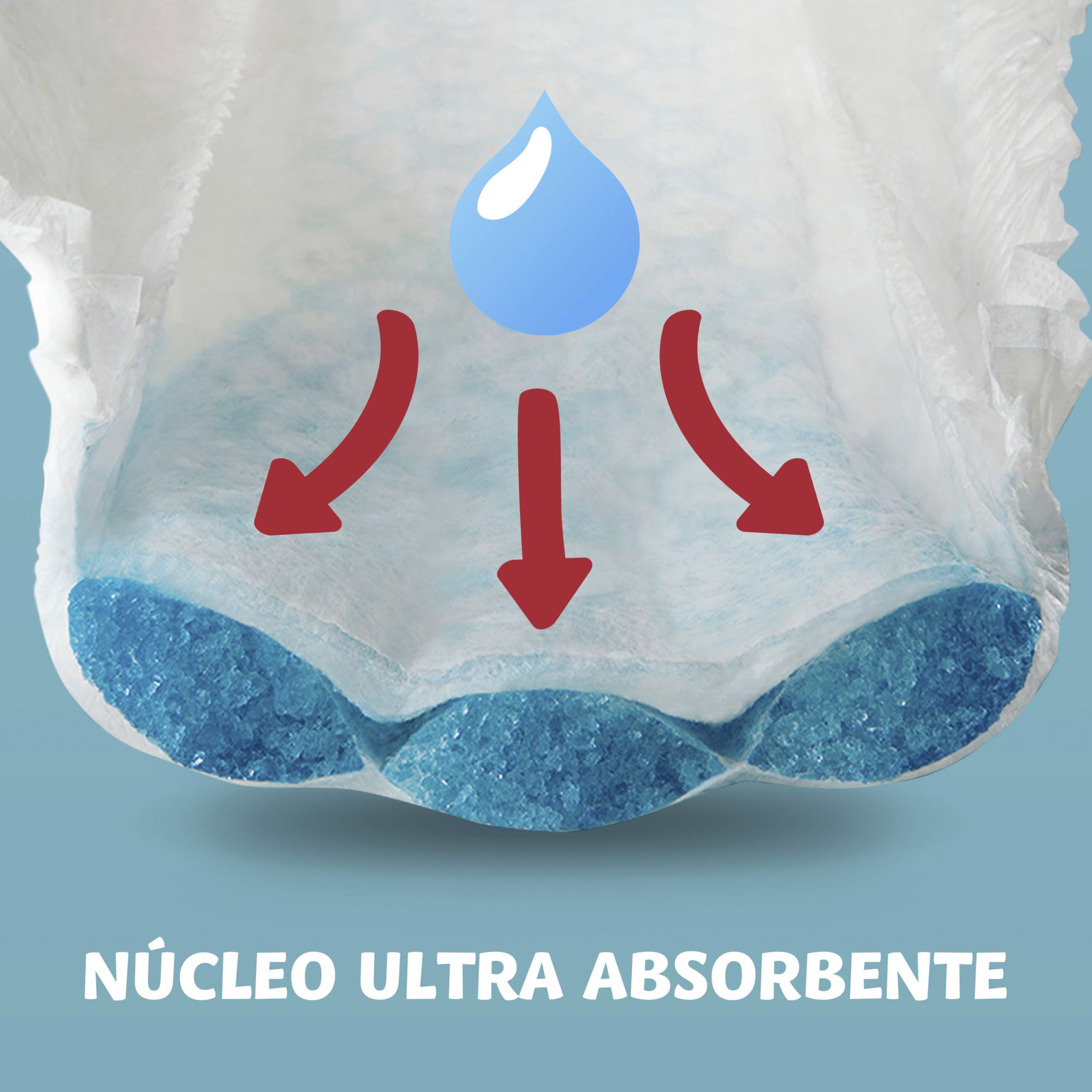 • Capa Ultra Absorbente que absorbe el pipí al instante ofreciendo hasta 12 horas de sequedad