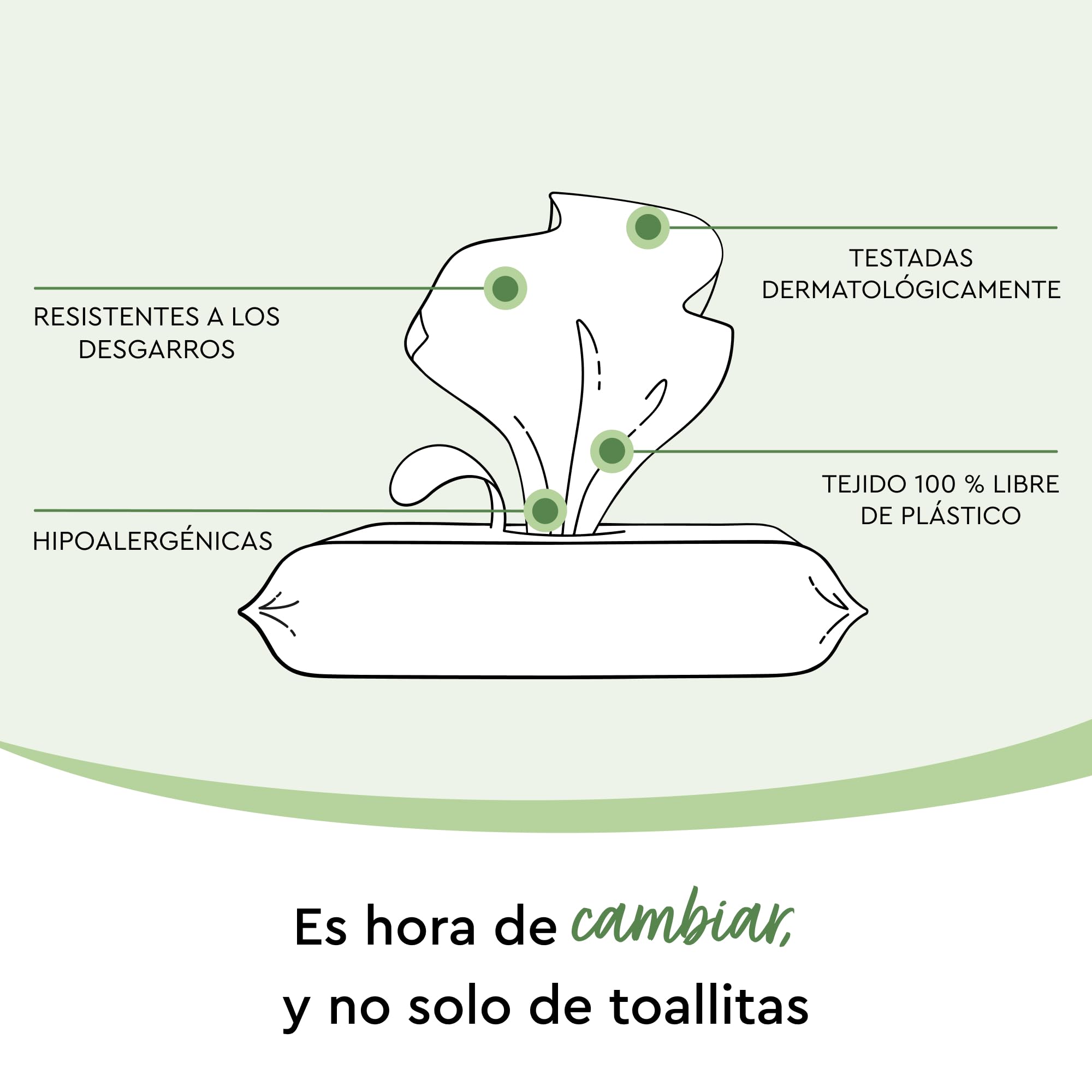 • Toallitas 100 % libres de plástico hechas con fibras de origen vegetal