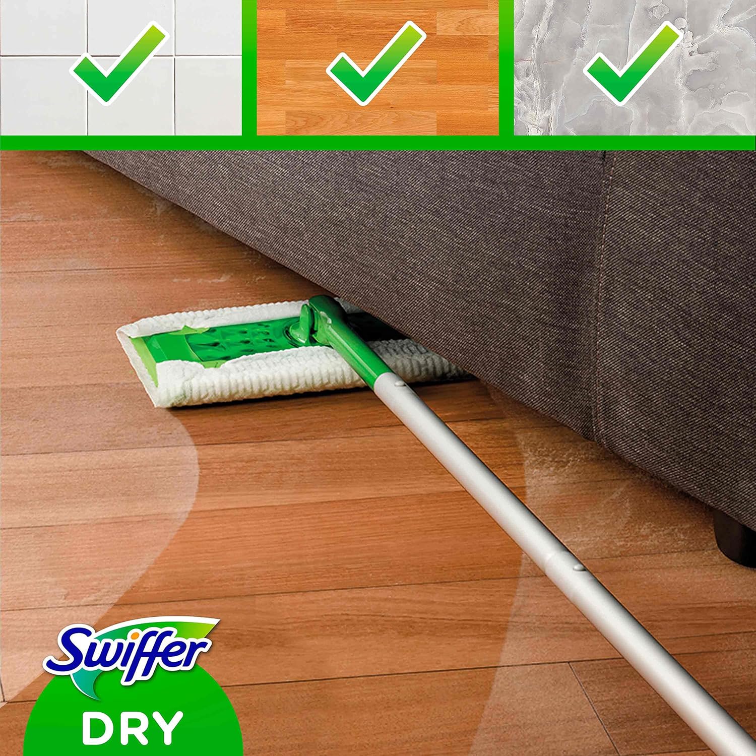 Os panos de substituição secos e húmidos da Swiffer são usados com a vassoura Sweeper para prender e reter a sujidade, o pó e o cabelo em qualquer superfície da sua casa, 3 vezes ideal do que uma vassoura tradicional. As recargas secas podem ser usadas como complemento do aspirador de pó, para prender o pó fino restante, ou como ferramenta de limpeza intermediária, enquanto as recargas húmidas com os seus potentes produtos de limpeza que dissolvem a sujidade tornam a limpeza do chão de azulejos ou linóleo da sua casa fácil e rápida: um truque para evitar uma limpeza profunda demasiado frequente. Além disso, a cabeça giratória de 360° da esfregona Swiffer permite limpar qualquer canto, inclusive locais difíceis, como debaixo do frigorífico, forno e máquina de lavar louça, sob as camas, sofás ou cantos e bordas que as vassouras não chegam. Não é o ideal? Não utilizar os panos húmidos para esfregona Swiffer em tábuas de madeira sem acabamento, lubrificadas ou enceradas, em azulejos não selados nem em pisos com carpete.