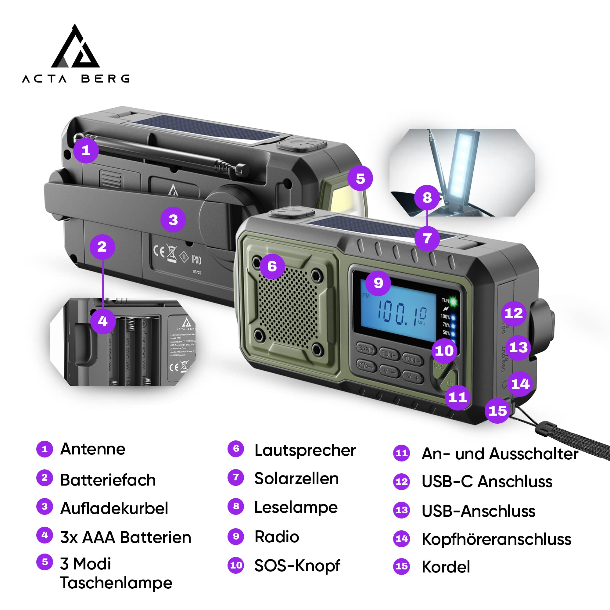 • ¿Se puede utilizar en el futuro Esa no es la regla para muchos campistas & Exteriores, pero con nosotros! Con la radio de manivela Acta Berg, no solo disfrutarás de una recepción perfecta gracias a la antena ultra fina, sino también de la búsqueda automática de emisoras y una pantalla digital