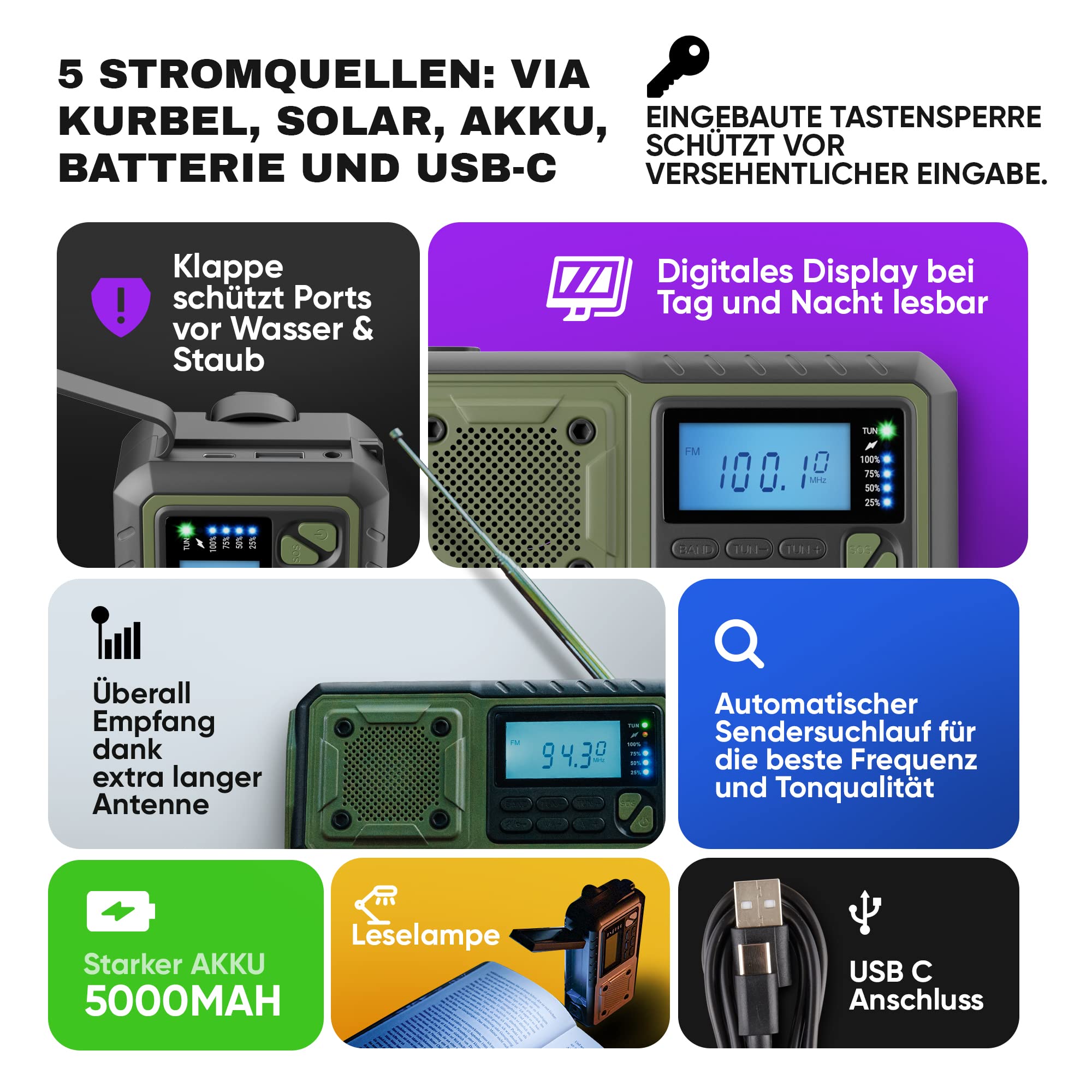 • Fácil de usar: Hecho de plástico ABS de alta calidad, tu radio de emergencia es extremadamente duradera y resistente. Al mismo tiempo, hacemos algo por el medio ambiente y plantamos nuevos árboles en regiones taladas de Alemania.