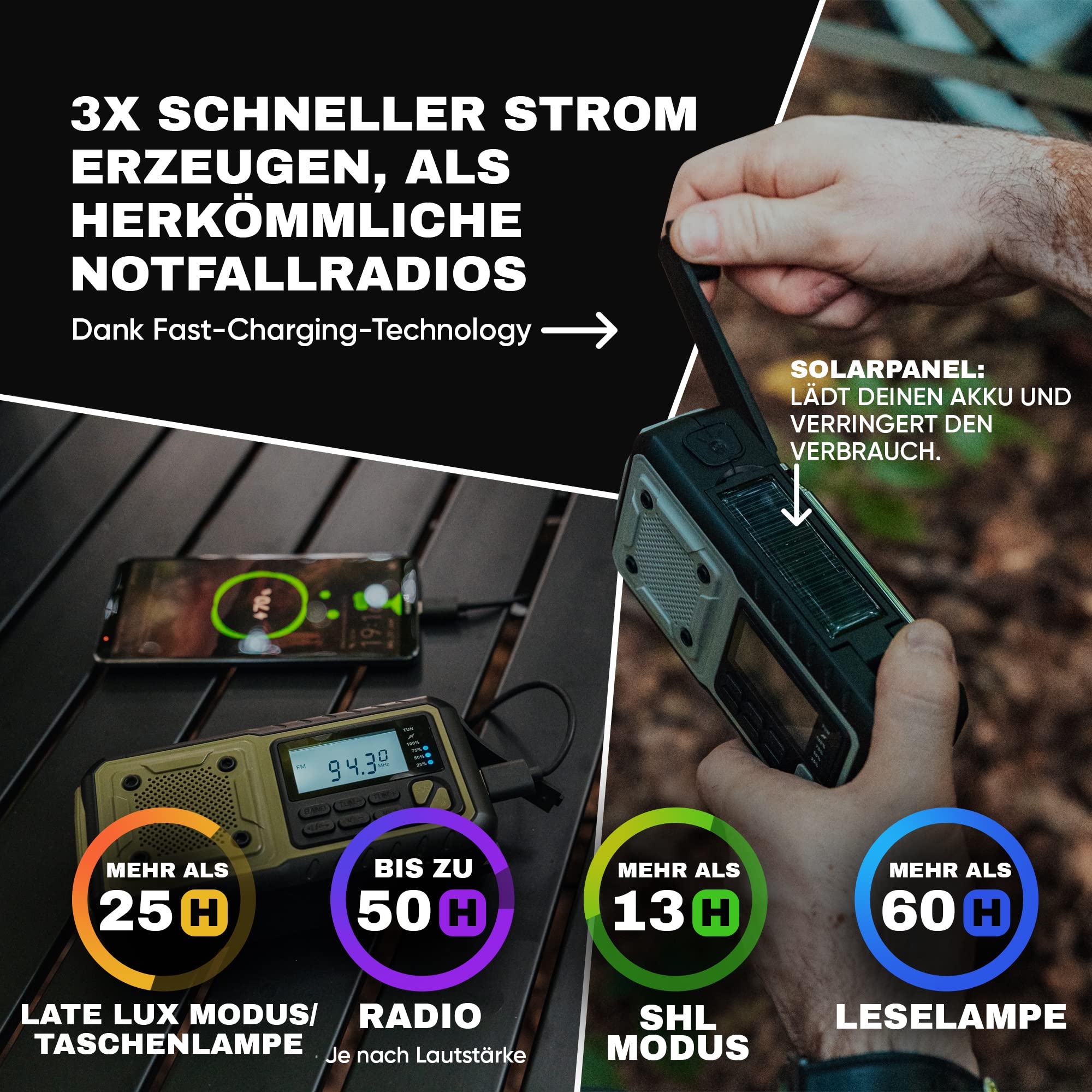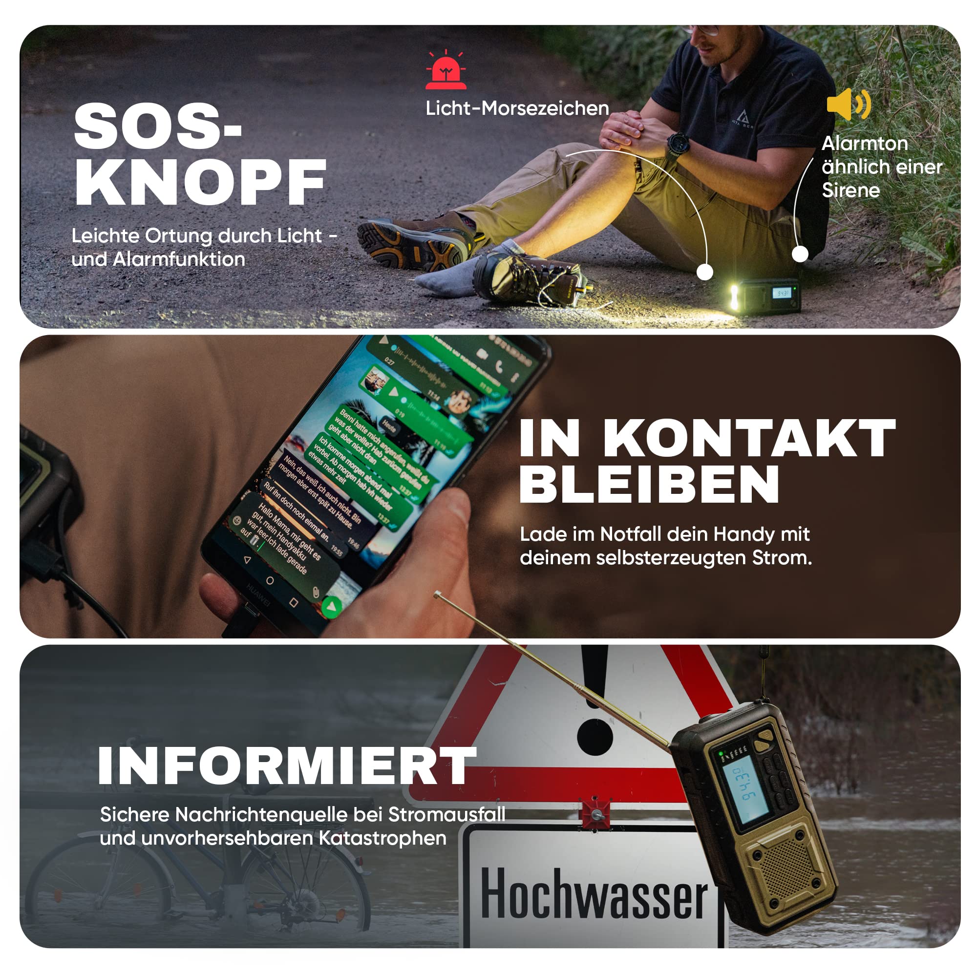 • Fácil de usar: No importa si te gusta acampar, hacer senderismo o entrar en situaciones brenzliche - con nuestra radio de emergencia definitivamente te has . Gracias a su capacidad de respuesta, generamos hasta 3 veces más energía que las radios de emergencia convencionales