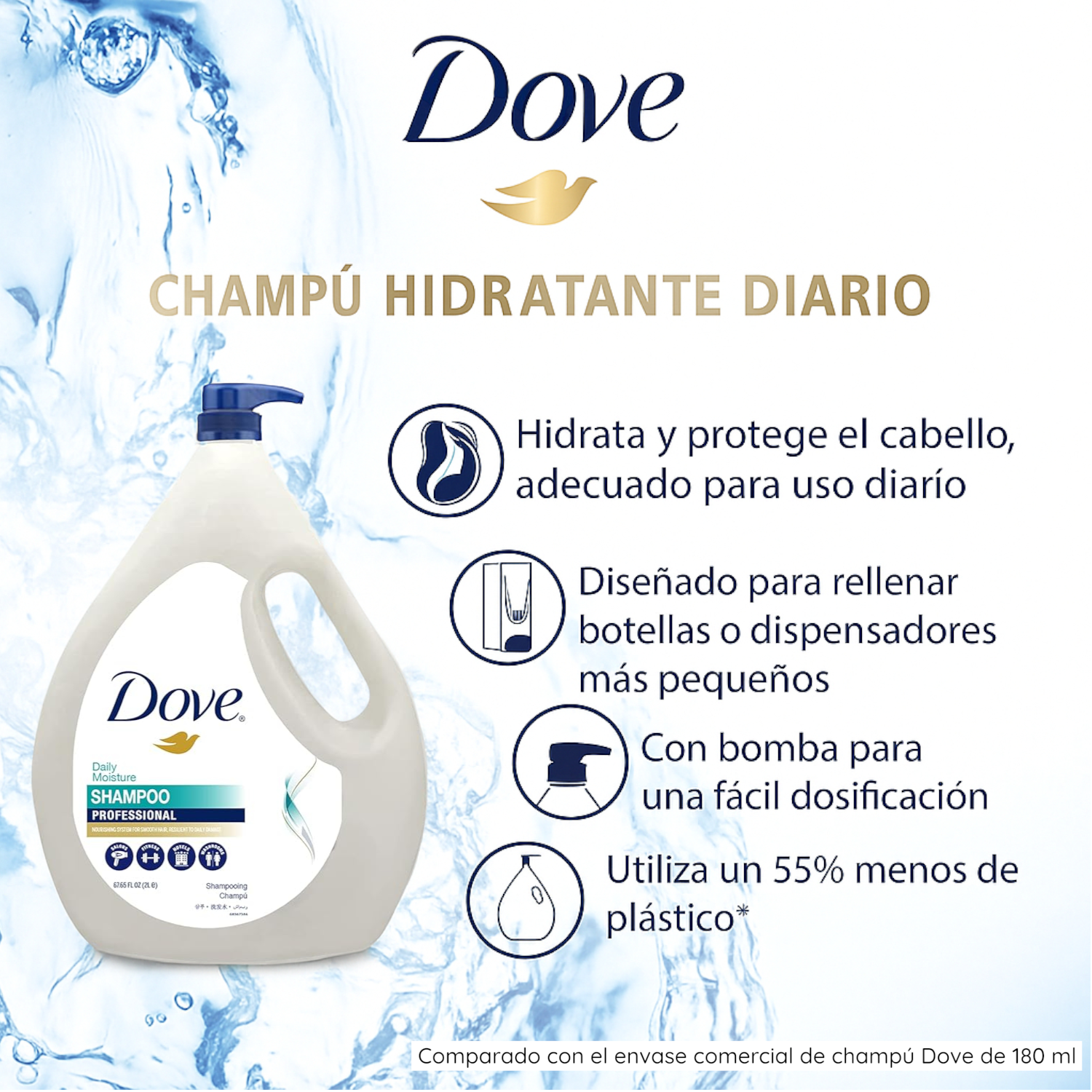 El Dove Champú Profesional Hidratante Diario 2 L con dosificador Pump ofrece una limpieza profunda y un cuidado superior, ideal para el uso diario tanto en casa como en entornos profesionales. Su fórmula avanzada, enriquecida con nutrientes esenciales y agentes hidratantes, ayuda a reparar el cabello seco o dañado desde la raíz hasta las puntas, dejando una sensación de suavidad, brillo y frescura duradera. Gracias a su formato económico de 2 litros y su práctico dosificador, es perfecto para peluquerías, spas, gimnasios y hoteles que buscan un producto eficiente, higiénico y de calidad profesional. Su textura cremosa y su delicado aroma aportan una experiencia de lavado agradable y revitalizante. Apto para todo tipo de cabello, especialmente los que necesitan hidratación adicional, este champú mantiene el equilibrio natural del cuero cabelludo y facilita el peinado, proporcionando un aspecto saludable y cuidado cada día.