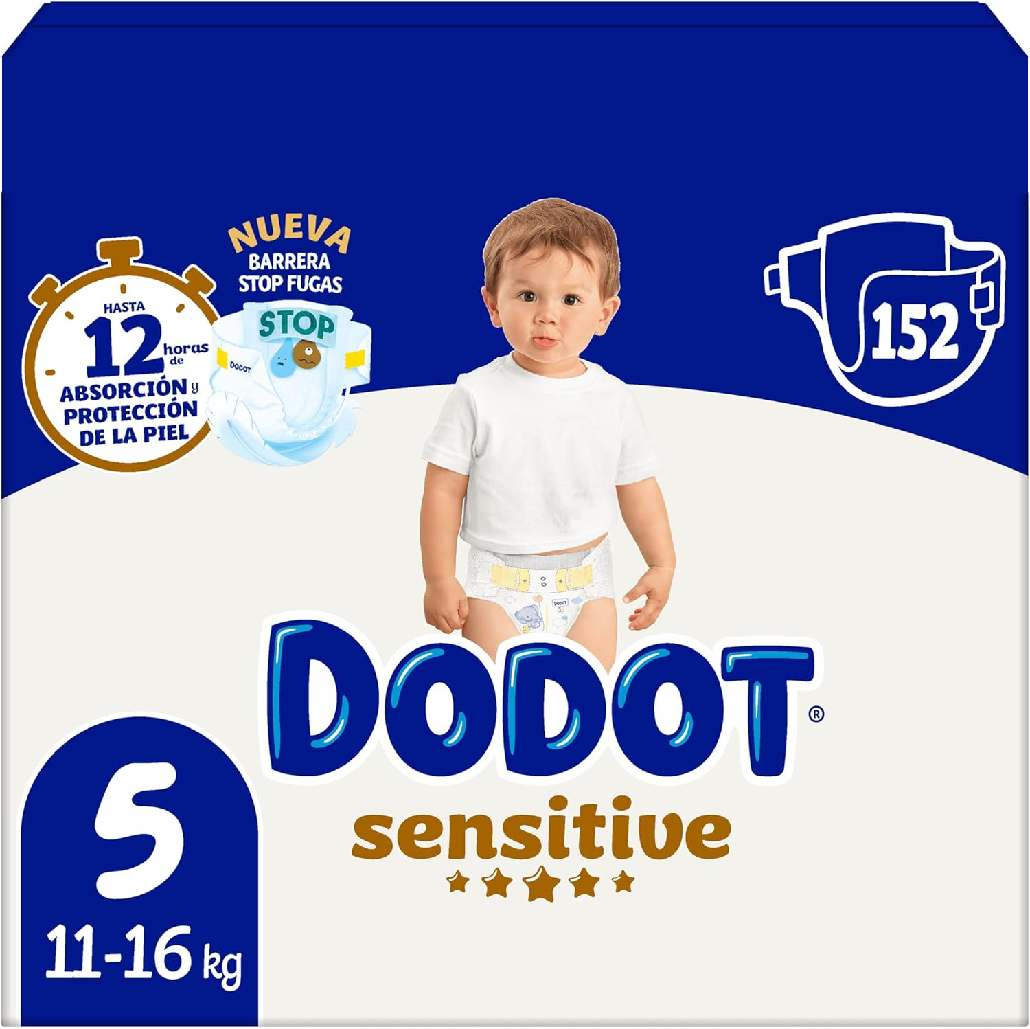 Dodot Fraldas de bebé sensível tamanho 5 (11 - 16 kg), 152 fraldas + 4 calças grátis, ótima proteção da pele de Dodot, pack mensal