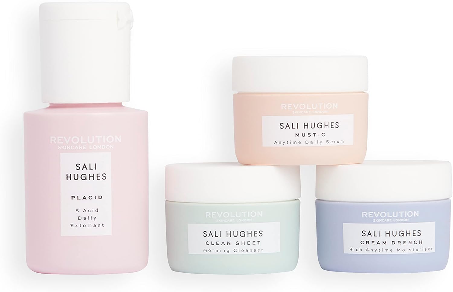 - KIT TUDO em um: As suas fórmulas favoritas de Sali Hughes x Revolution, agora em formato mini recarregável! Sustentável e adequado para viagens, este kit de cuidados com a pele contém quatro produtos da gama, todos embalados em 100 % necessaire de algodão.