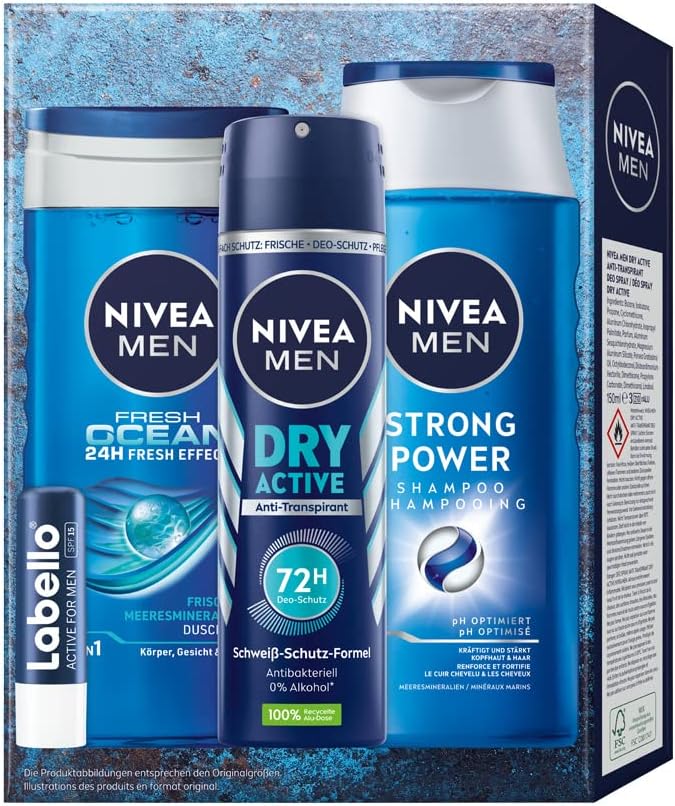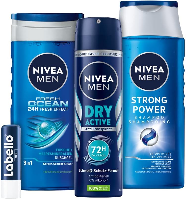 Descubra o conjunto de energia forte da Nivea. O chuveiro de banho Nivea Fresh Ocean proporciona uma experiência refrescante de chuveiro e aroma fresco ao oceano. O spray desodorizante ativo para homem da Nivea convence com um aroma fresco e masculino e oferece 72 horas de proteção eficaz contra a humidade das axilas e o odor corporal. O cuidado ideal para o cabelo oferece o champô Strong Power da Nivea para homem. Fortalece o cabelo mensurável e proporciona plenitude e força. Também está incluído no conjunto Labello Men Active. A sua fórmula nutritiva com óleos naturais hidrata intensamente 24 horas e protege dos lábios secos e rachados. Testado clinicamente.