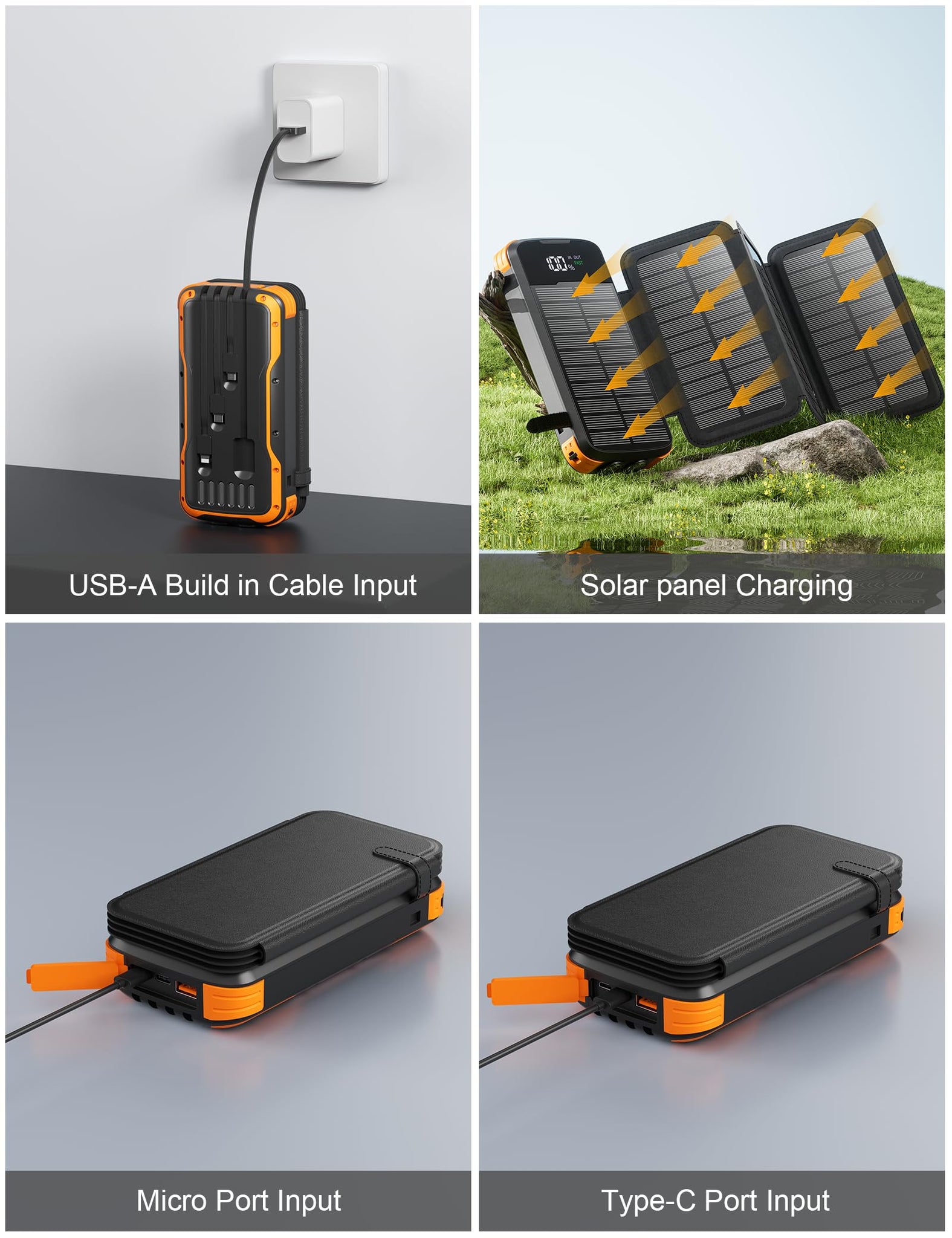 - 【4 cables de carga integrados y 9 opciones de carga】 Este cargador portátil está equipado con 3 cables de salida (Tipo C*1 & iOS *1 & Micro USB*1) y 1 cable de entrada USB-A. Ya sea de salida o de entrada, no necesitas llevar cables de carga contigo. Incluye 5 salidas (iOS, Tipo C, Tipo C a C, USB-A, Micro) y 4 entradas (panel solar, Tipo C, Micro, USB-A). Que son adecuados para la mayoría de los dispositivos, puede utilizarlos para reemplazar los cables rotos.