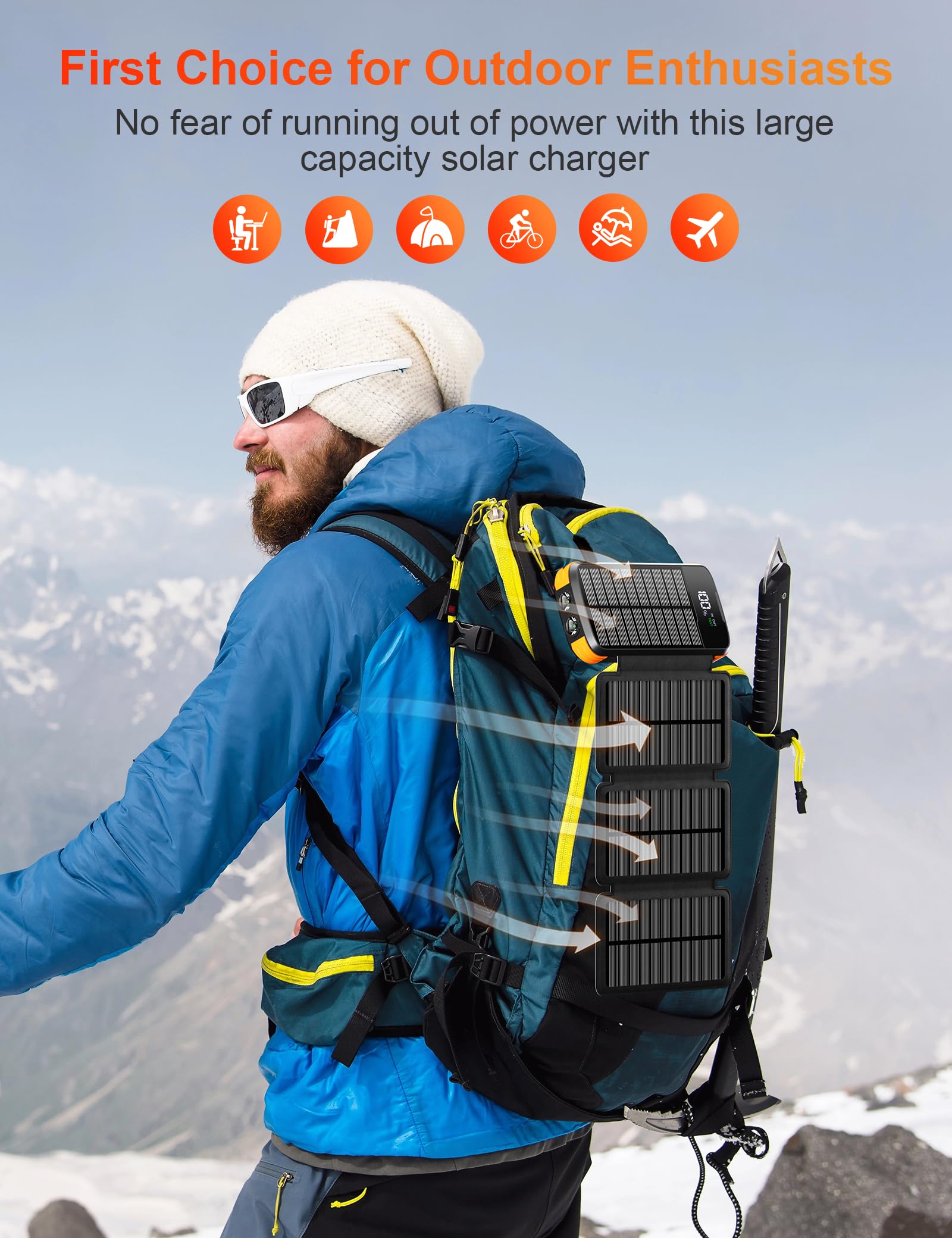 - 【27000mAh Capacidad Masiva】El powerbank solar puede cargar para iPhone 13 hasta 7 veces, para un Galaxy S22 hasta 5 veces, para una tableta hasta 3 veces. El cargador solar para móvil mantiene tu smartphone funcionando todo el día y cubre tus necesidades de carga durante una semana. Con el diseño de la pantalla LED, puedes ver la carga exacta de la batería.