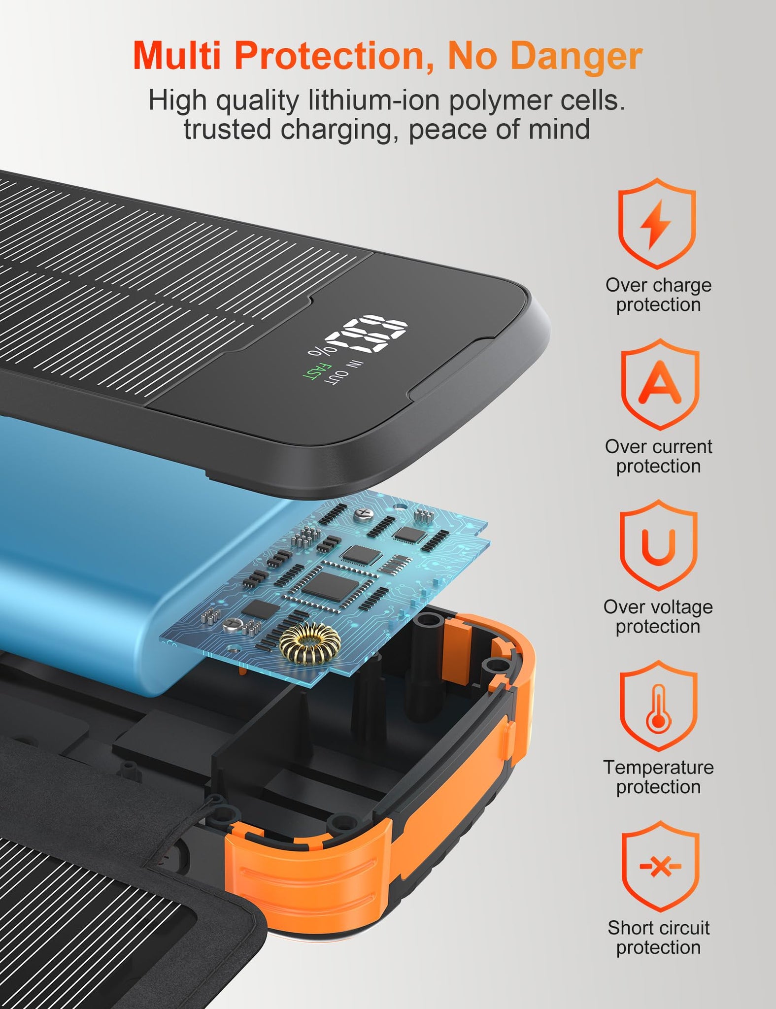 - 【Durabilidad y seguridad】 Batería de alto rendimiento y material de alta calidad garantizan una larga vida útil. Tecnología de protección avanzada puede proteger el cargador solar y sus dispositivos de sobrecarga, sobrecorriente, sobrecalentamiento y cortocircuitos.